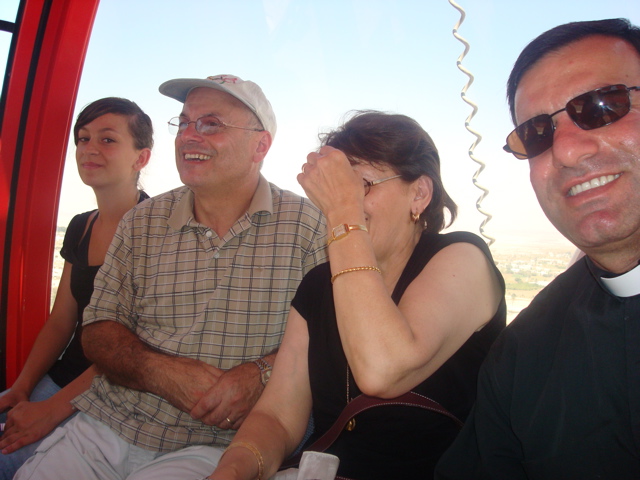 Nicole, George, Widad, and Father Samer in the cable car to Mount Temptation (sy)