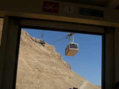 Taking the cable car to Mount Temptation, with Jerico behind and below (sy)