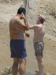 David talks with the bathhouse attendant at the Dead Sea (rw)