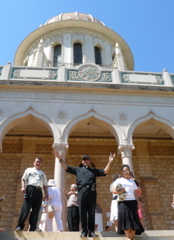 Hope taking picture of Karim, Bill, Nichol, Nina at the gardens of the Baha'i Shrine of the Bab, Haifa (rw)
